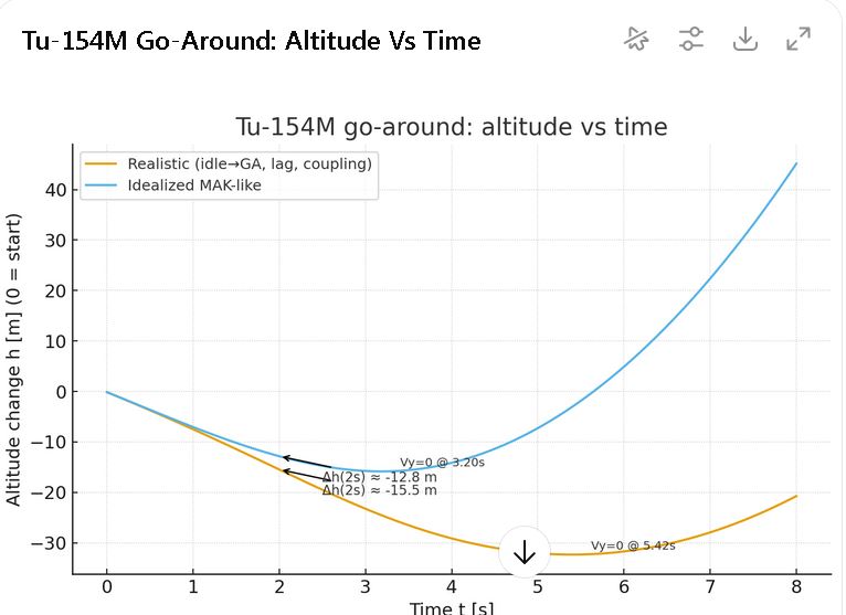 Contrast with an “idealised” trace: If you assume very fast Ny response, immediate thrust command and no coupling, you can obtain a shallow Δh to Vy=0 ≈ −16 m and ΔV ≈ −2.7 m/s. That picture, however, omits the Tu‑154’s known characteristics and crew delays—it is not a faithful reconstruction of a real‑world go‑around from near‑idle.