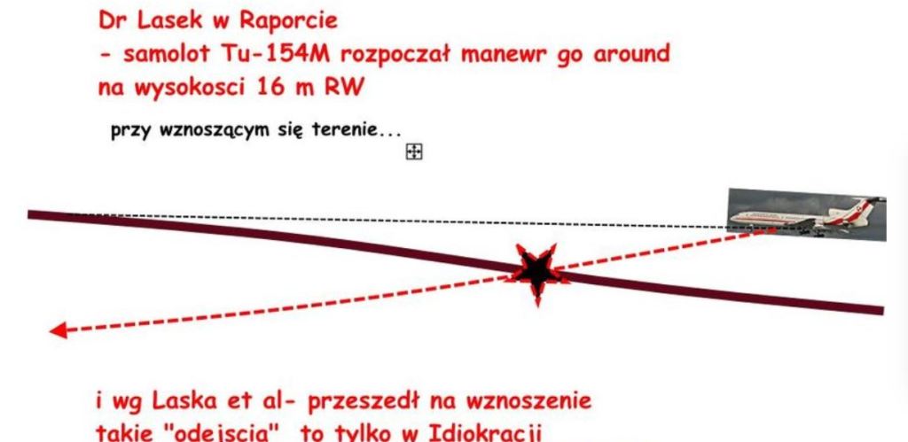 This statement clearly places the initiation of the go-around maneuver at just 16 meters above ground. However, given the known descent rate, aerodynamic configuration (full flaps, idle thrust), and terrain slope at Smolensk, such a go-around was physically impossible. The aircraft would have needed to perform a „miracle climb” from beneath the ground